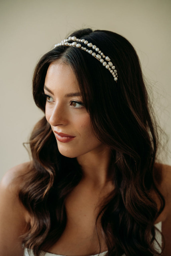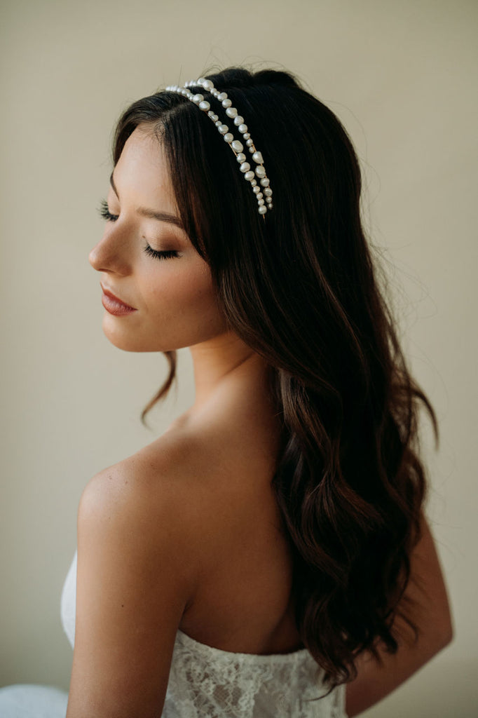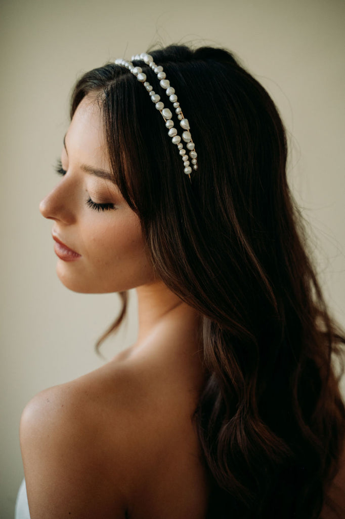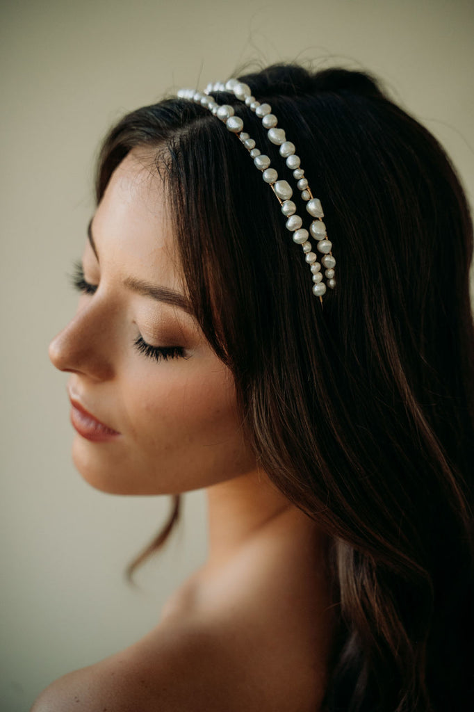 Add an elegant touch to your bridal look with the Milos Headband. This unique and modern accessory features a double headband design adorned with unique freshwater pearls. Perfect for the bohemian or minimalist bride, this statement headband adds a timeless and romantic touch to any ensemble.