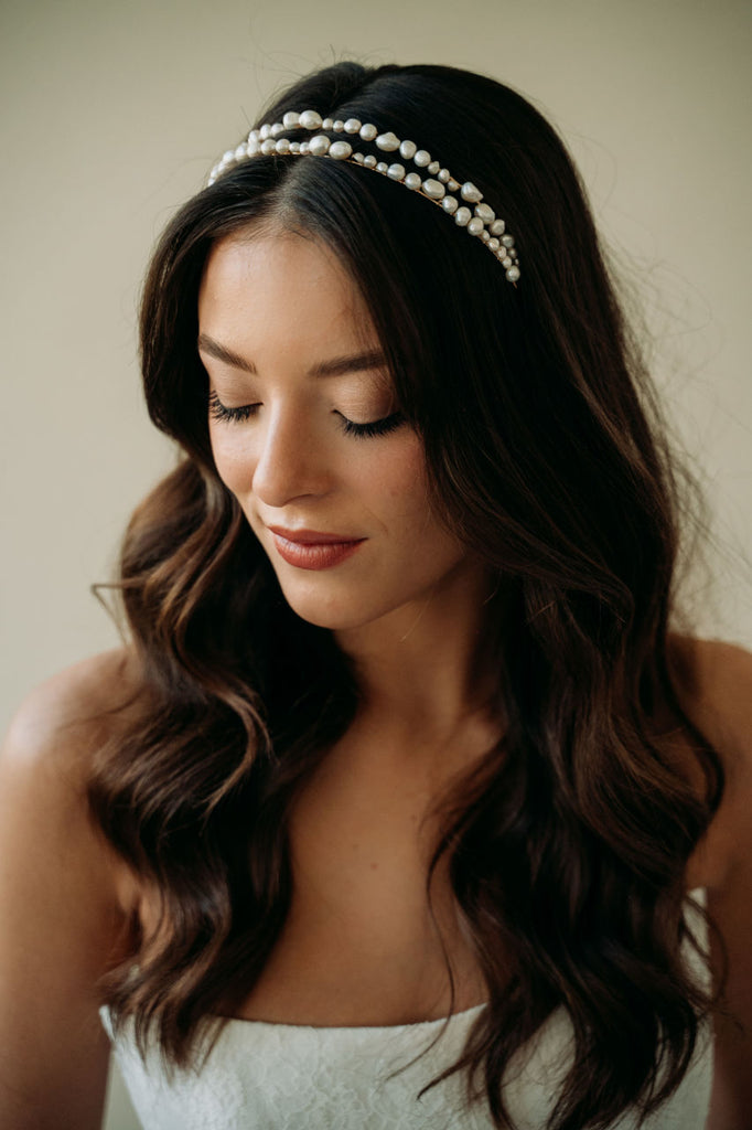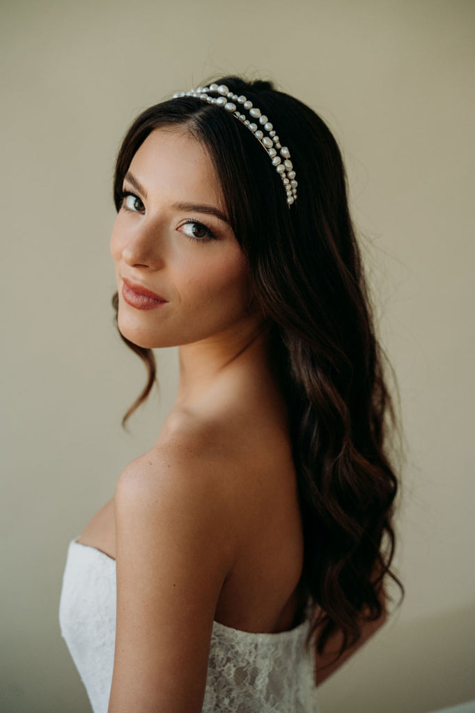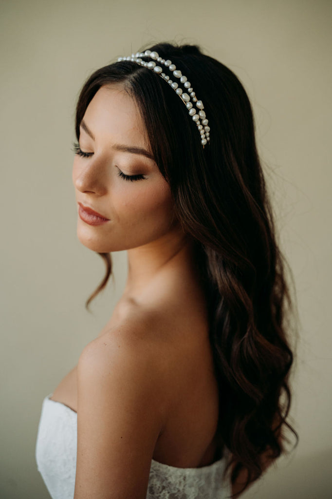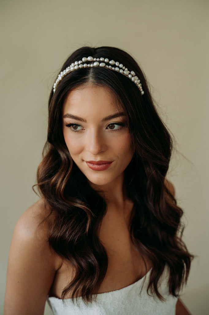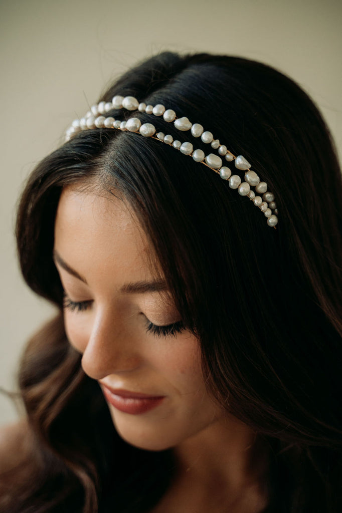 Add an elegant touch to your bridal look with the Milos Headband. This unique and modern accessory features a double headband design adorned with unique freshwater pearls. Perfect for the bohemian or minimalist bride, this statement headband adds a timeless and romantic touch to any ensemble.