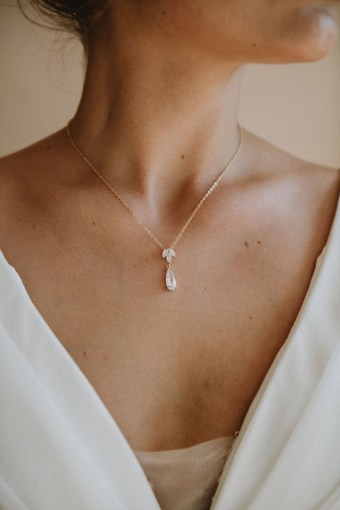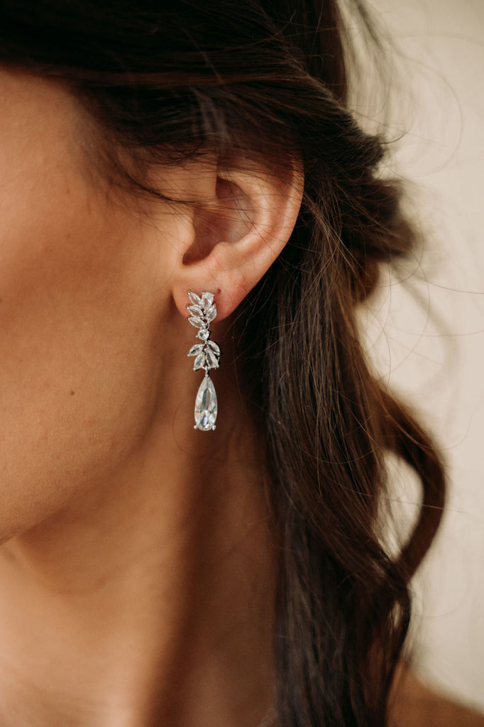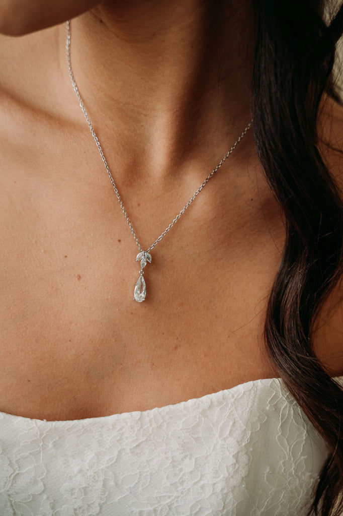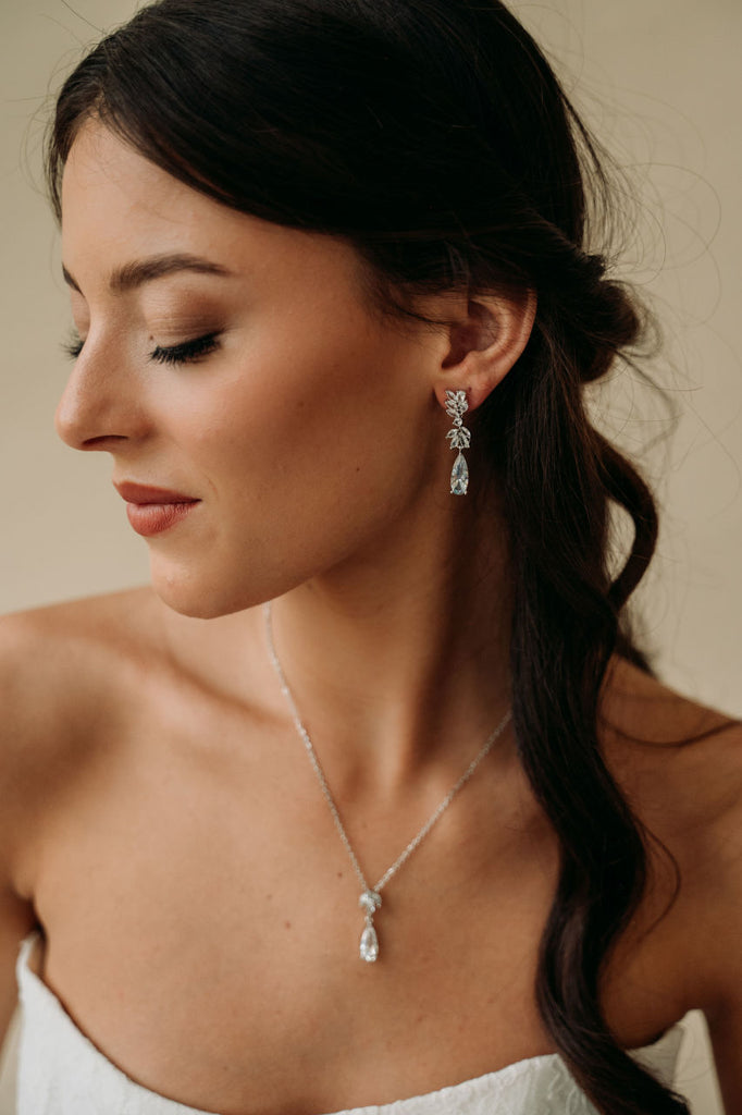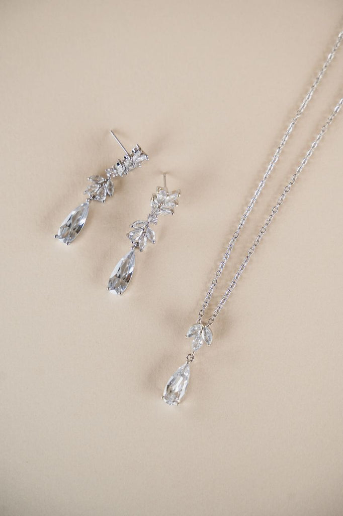This delicate crystal bridal set is the perfect addition to any wedding look. The earrings and necklace add a touch of elegance in either gold or silver. Complete your ensemble with this exquisite Alfina and Eilat set.