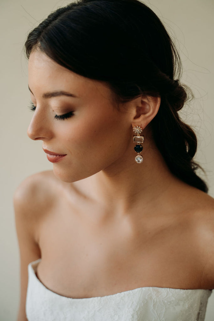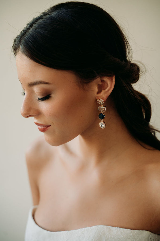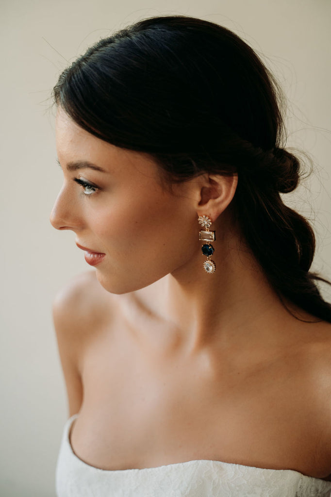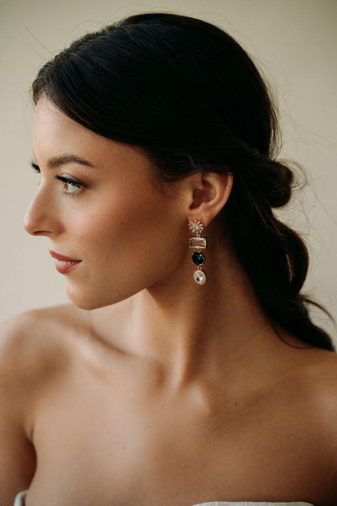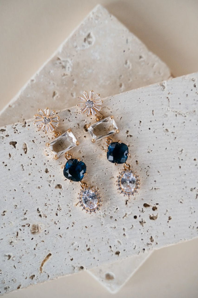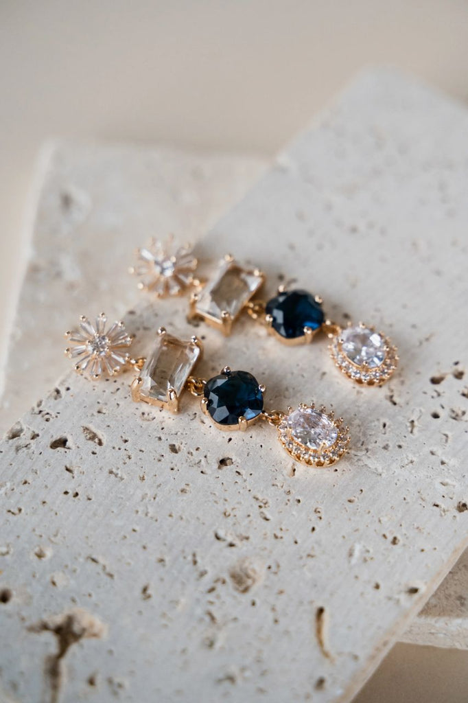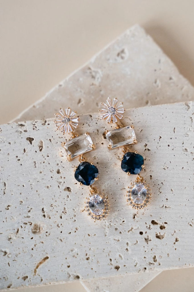 Indulge in luxury with the Cannes Earrings. These gold bridal earrings feature elegant crystal pendants and striking navy blue stones, creating a sophisticated and exclusive look. With a dangling drop design, these earrings are the perfect addition to elevate any wedding outfit.