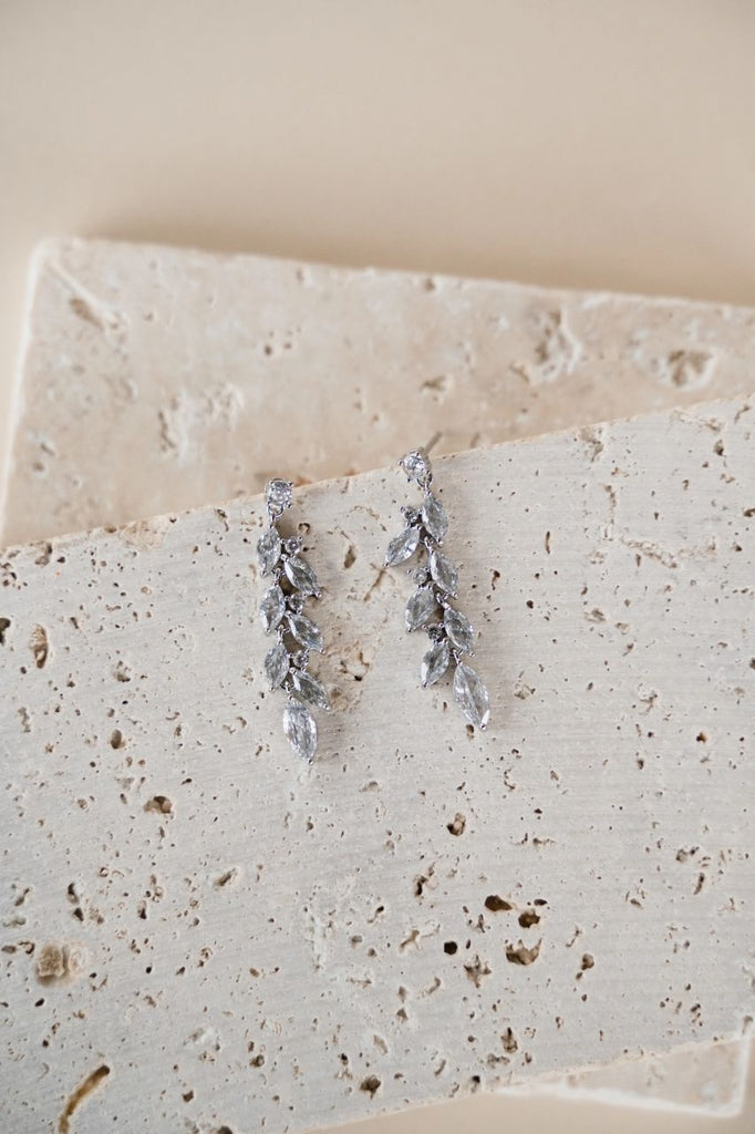 Petite trailing crystal leaves sparkle on these boho inspired wedding drop earrings. The perfect bridal accessory or bridesmaid gift.