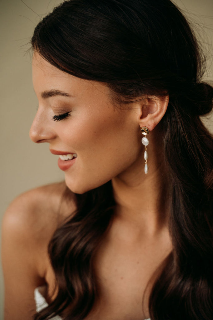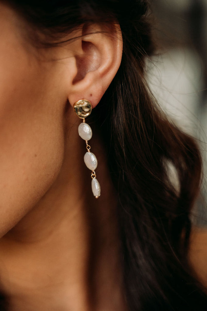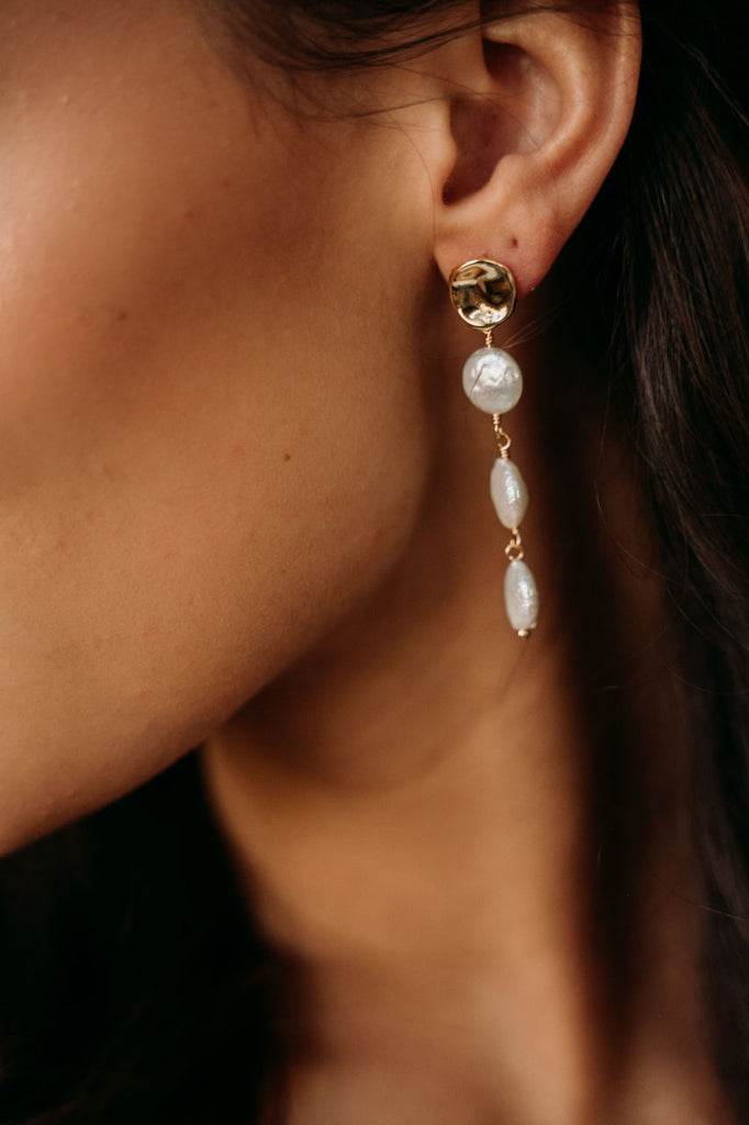 Our Hydra Earrings feature a gold hammered post and delicate freshwater coin pearls, creating a simple yet elegant design perfect for any occasion. Their minimalist style exudes femininity, and their unique design makes them a perfect choice for bridal earrings. Elevate your jewelry collection with these timeless and versatile earrings.