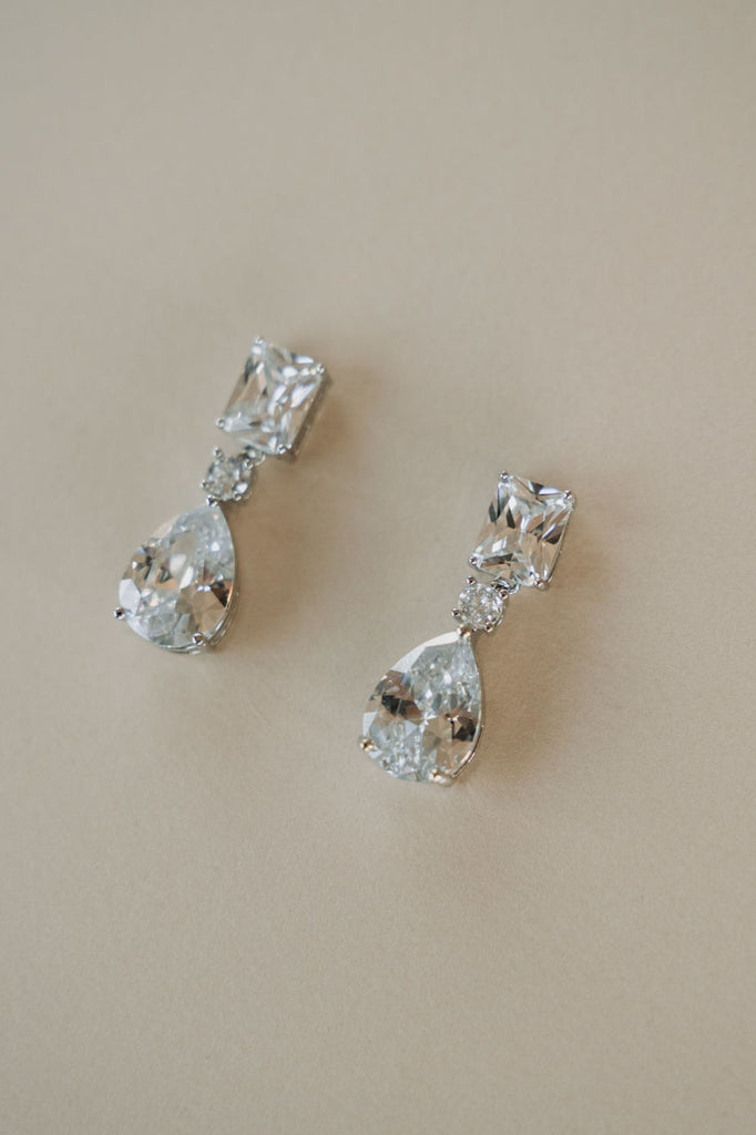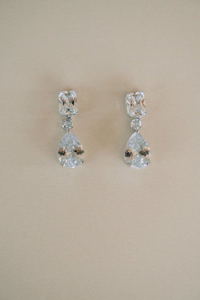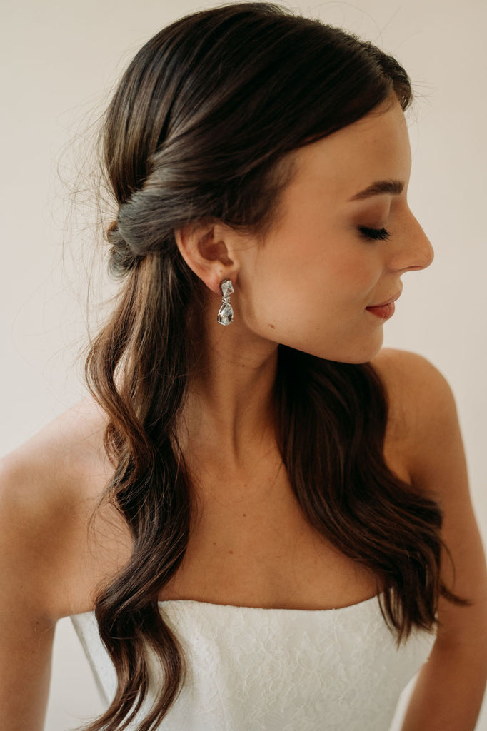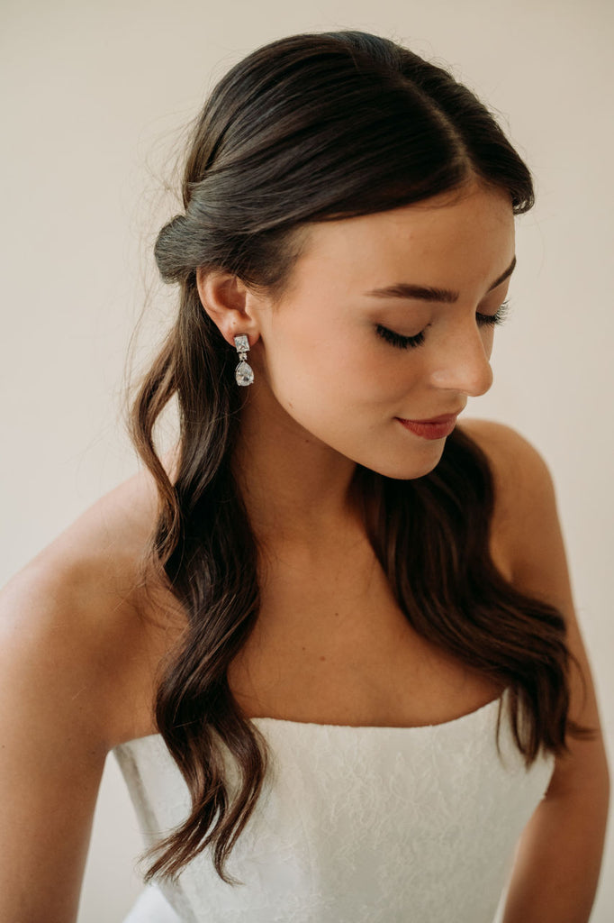 Sleek and sophisticated, these minimalist bridal drop earrings feature delicate crystals for a subtle, elegant sparkle - perfect for the modern bride who loves understated beauty.