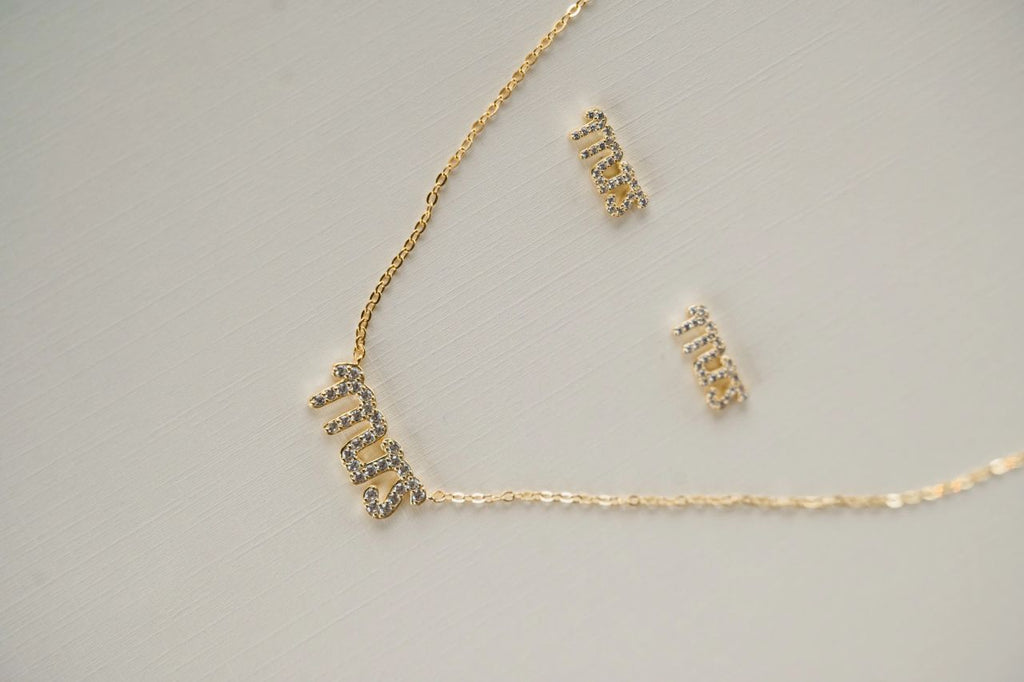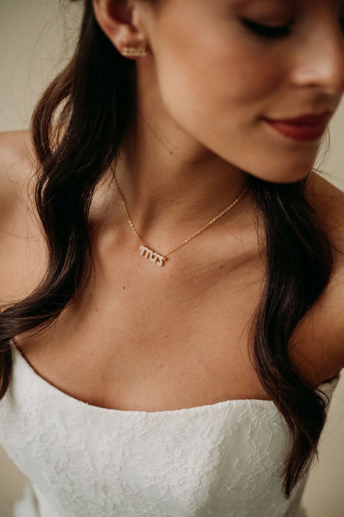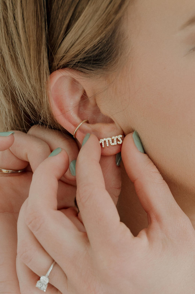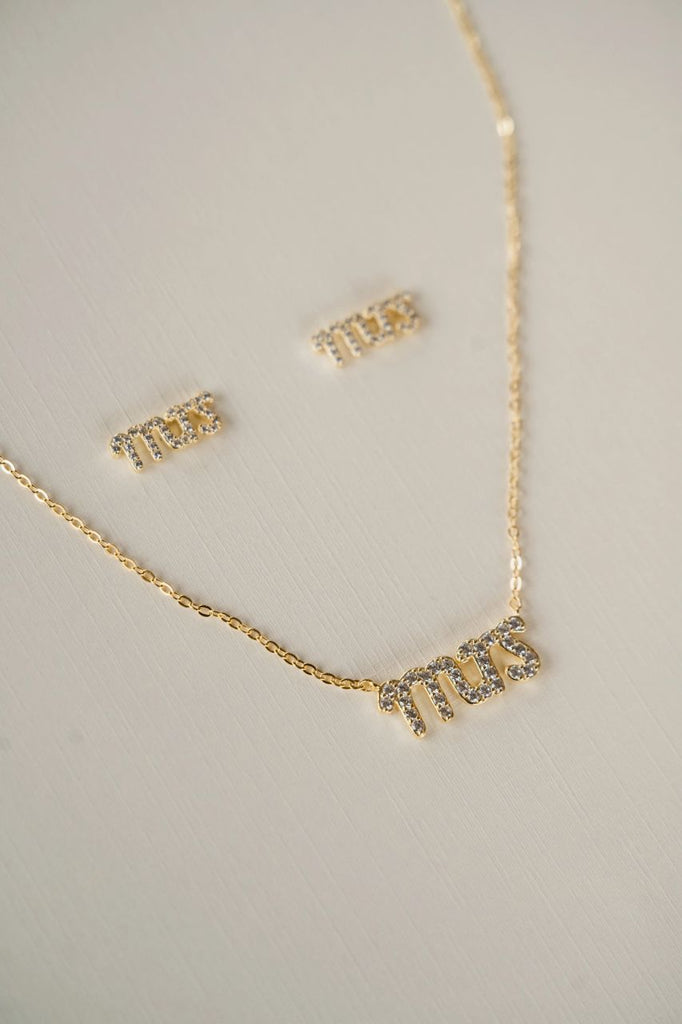 Say "I do" to these petite MRS stud earrings! Adorned with micro-pave crystals, they're the perfect accessory for any bride-to-be's big day and honeymoon. Available in a coordinating necklace.