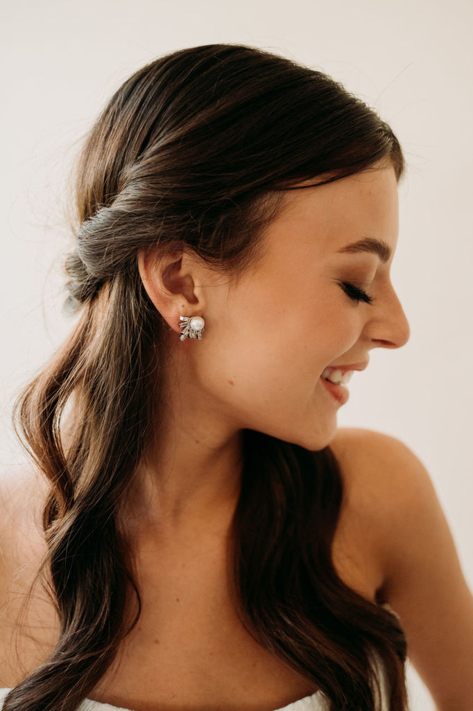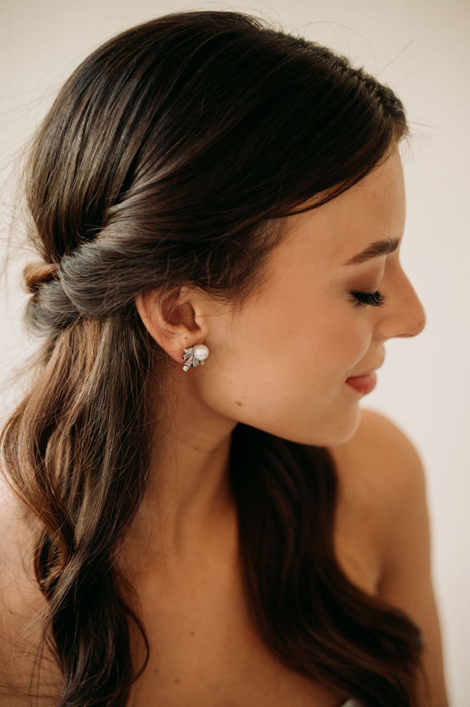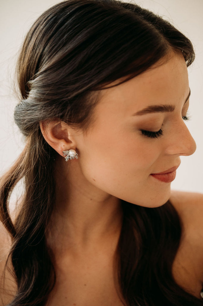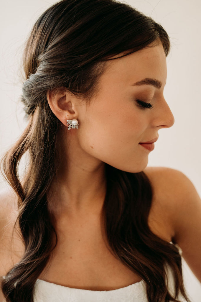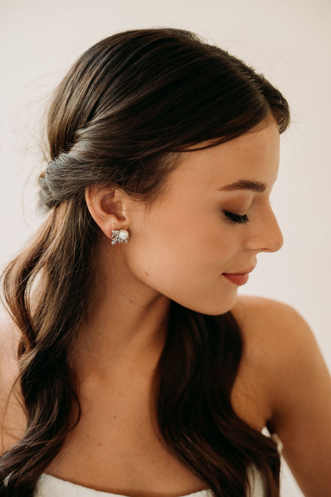 Petite baguette rhinestone crystals are scattered in a whimsical pattern on these luxe bridal stud earrings. These art deco inspired wedding earrings are the perfect minimalist bridal accessory or gift for your bridesmaids.
