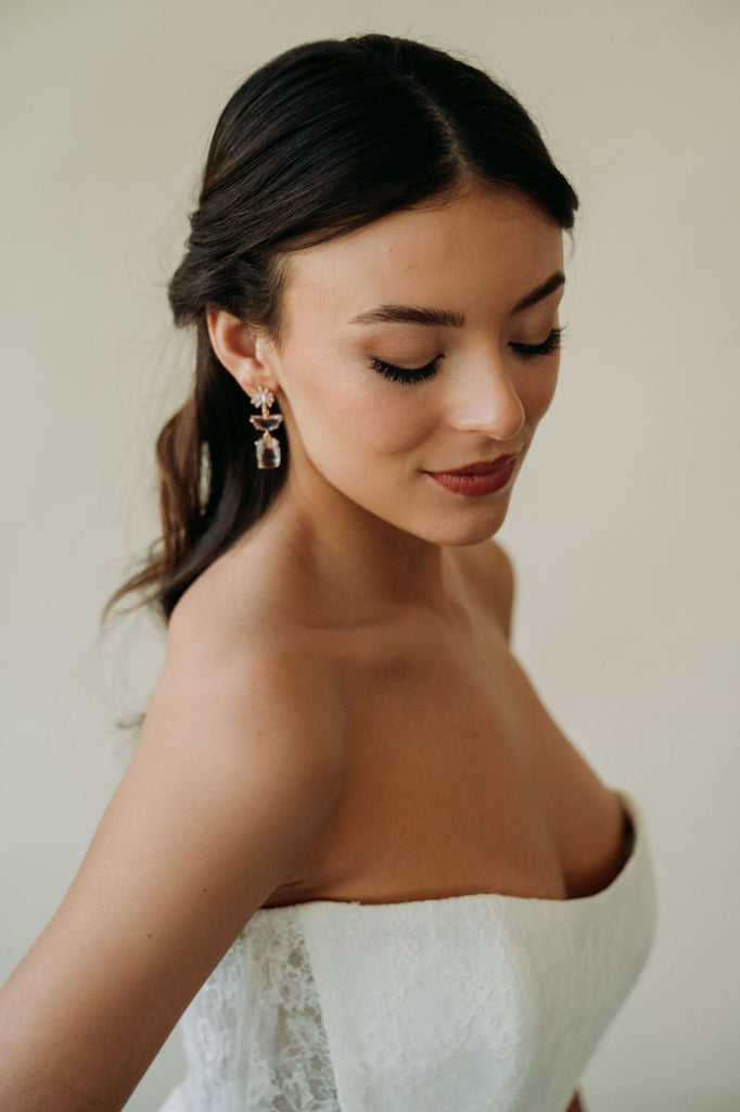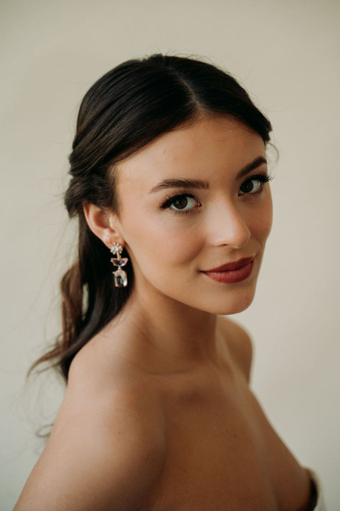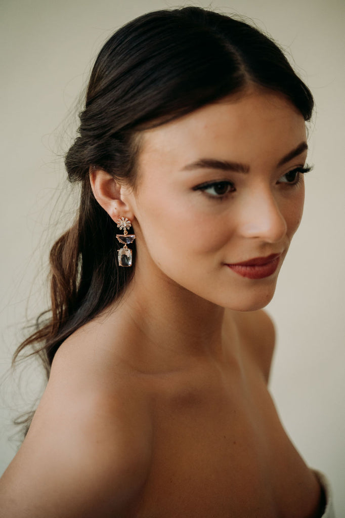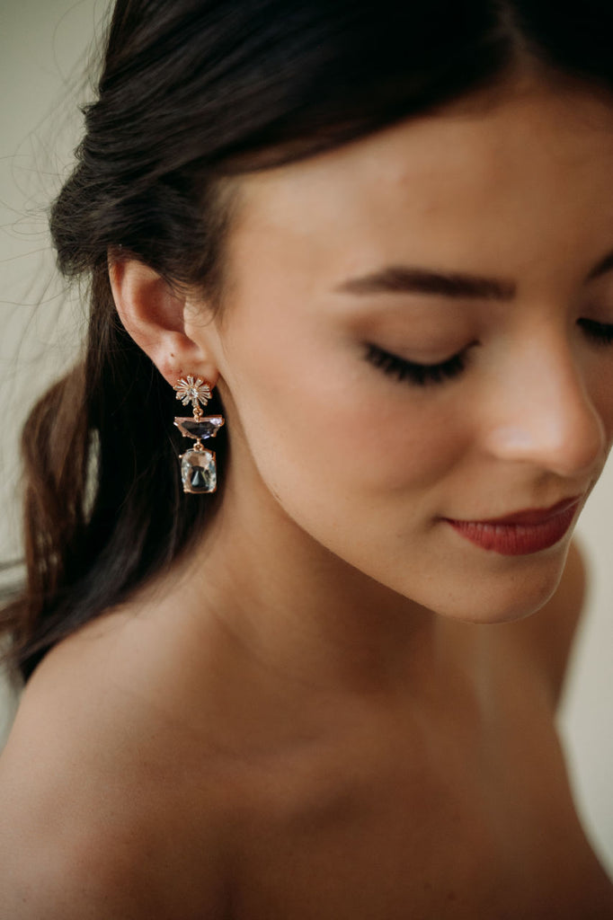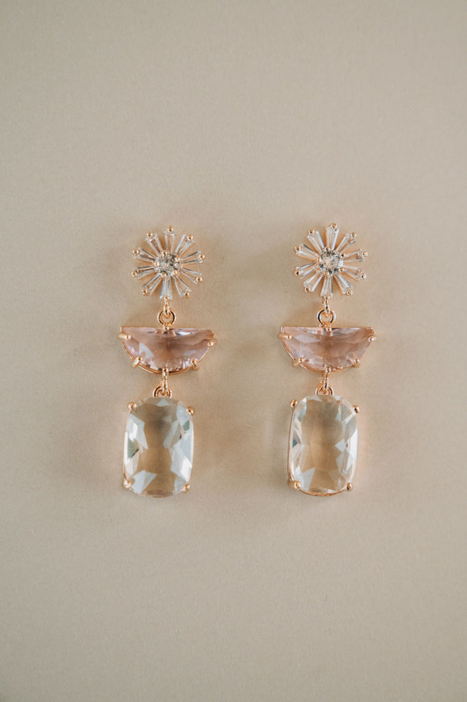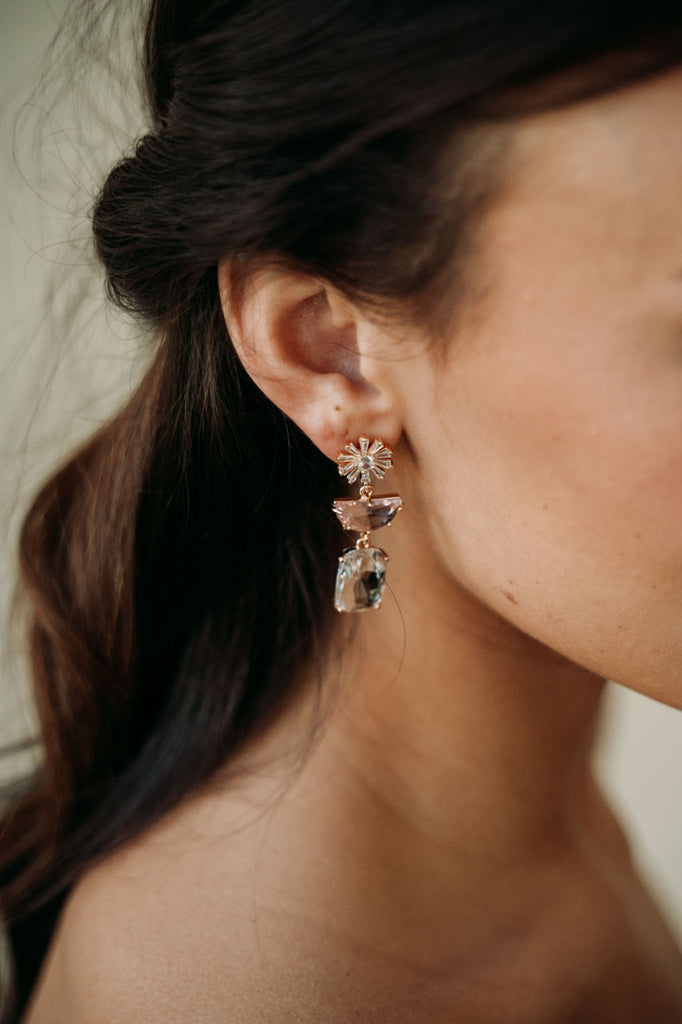 Elevate your style with our Posie Earrings. These lightweight crystal earrings feature pink crystal charms for a touch of elegance. Perfect for brides or special occasions, they will add a chic and luxurious touch to any outfit.