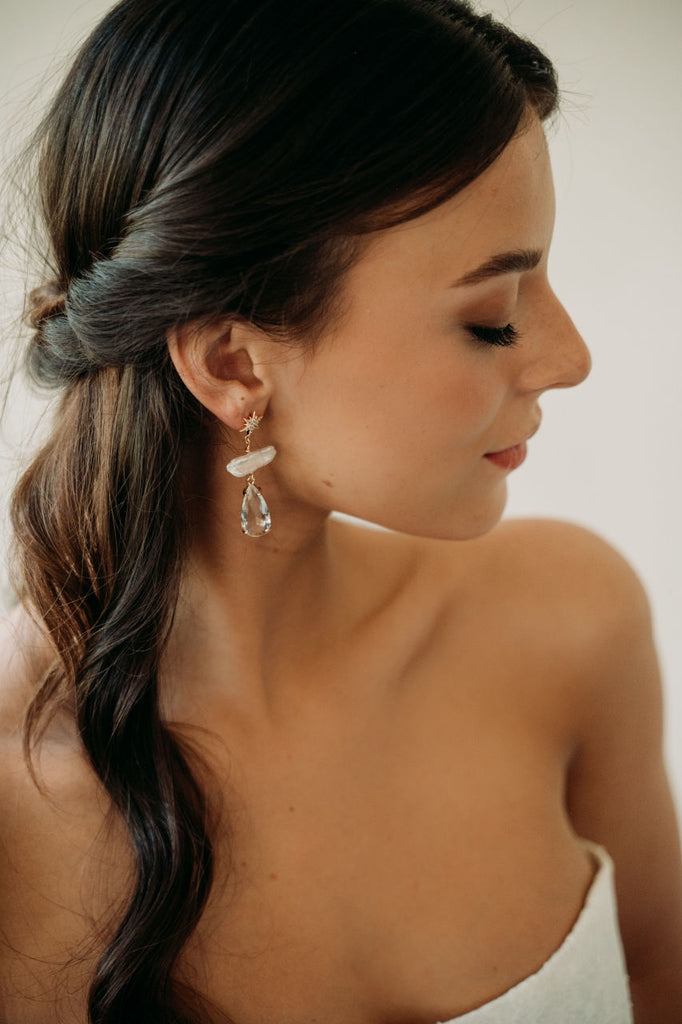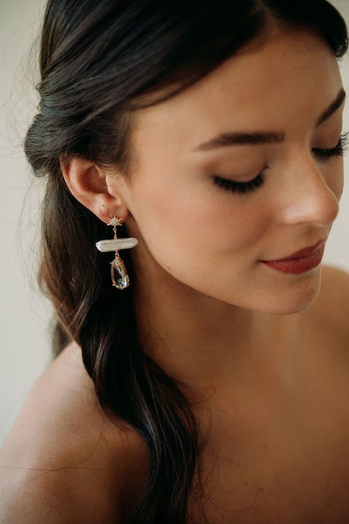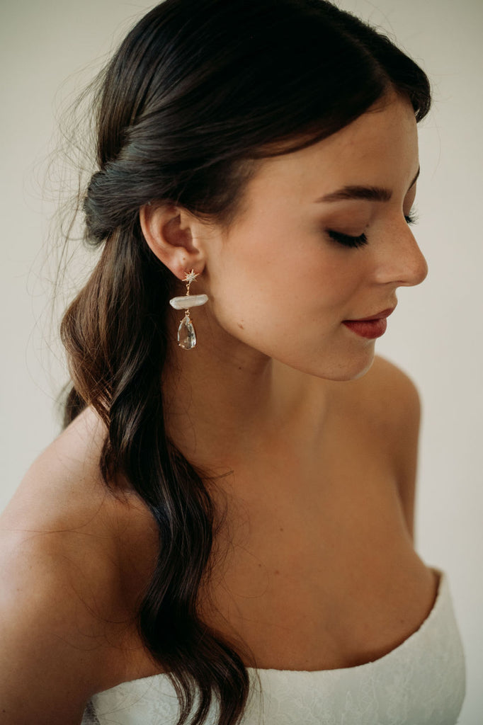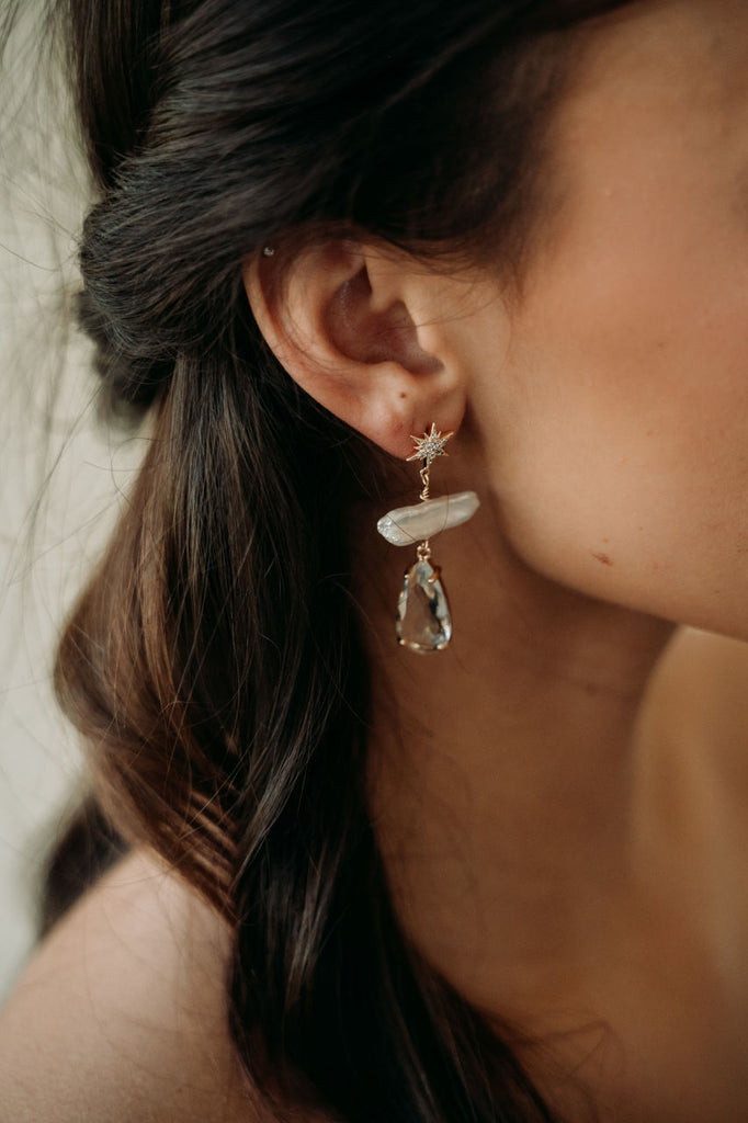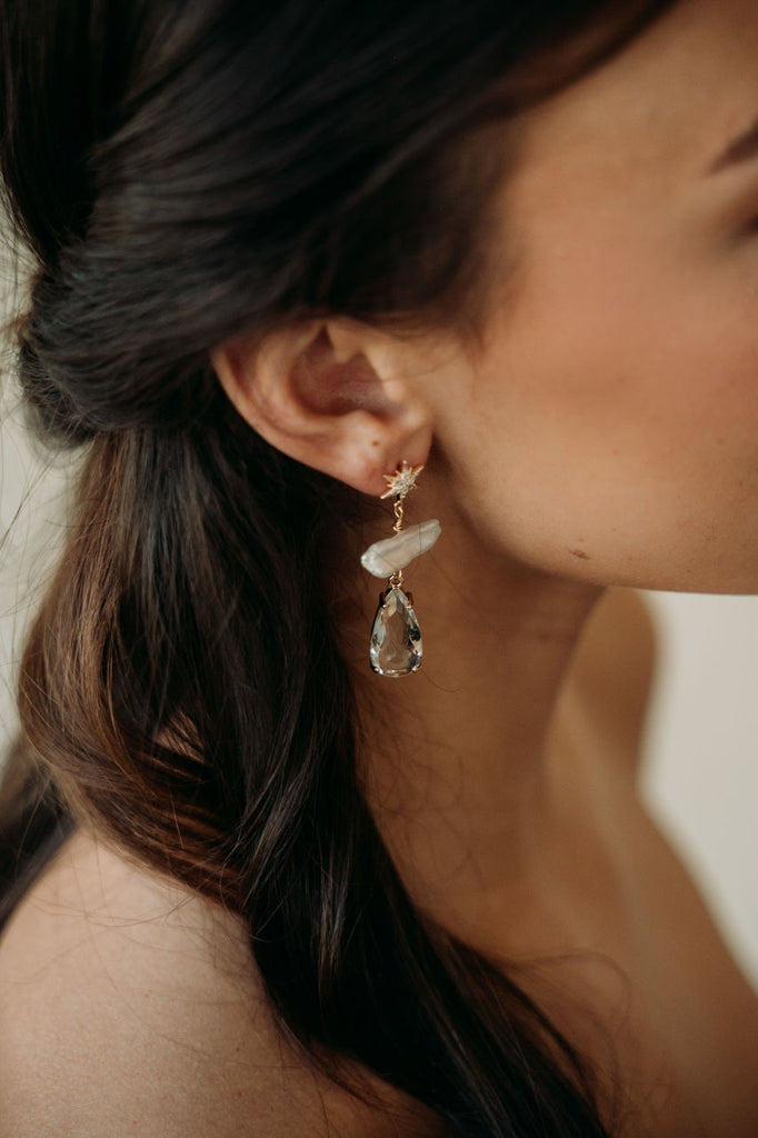 Introducing the stunning handmade Starla Earrings, perfect for brides seeking celestial inspiration. These beautiful dangle earrings feature crystal encrusted stars, a freshwater pearl and a crystal pendant. Elevate any look with these eye-catching gems.
