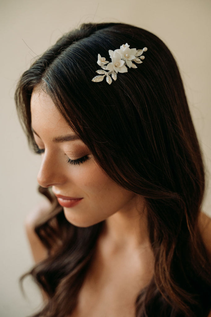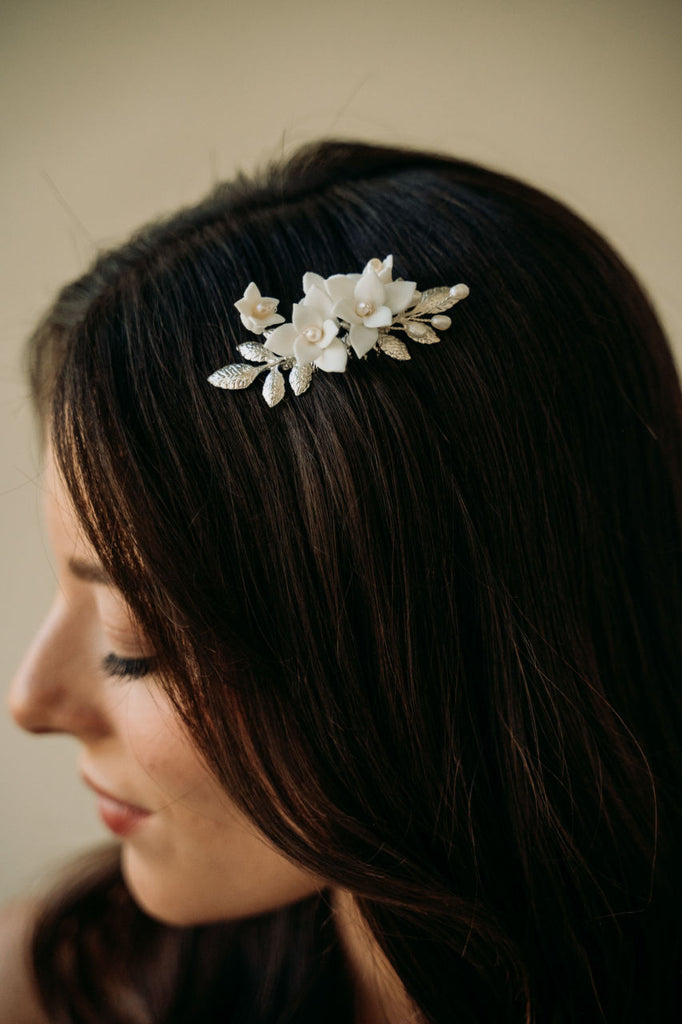 Inspired by spring blooms, our Paloma Hair Comb features clay flowers, freshwater pearls and shimmering leaves hand wired to a petite hair comb.