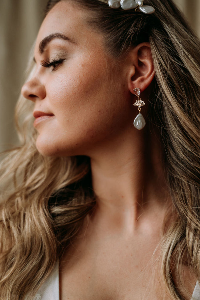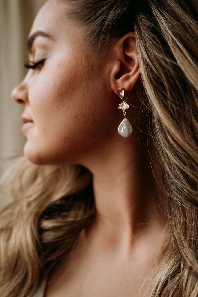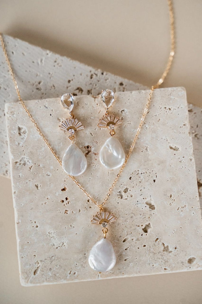 Add vintage charm to your wedding day look with the Amalfi Bridal Set. This stunning necklace and earring set features art deco crystal charms that add sparkle and elegance to any bridal ensemble. The set also includes freshwater pearls for a touch of sophistication. Say "I do" in style with the Amalfi Bridal Set!
