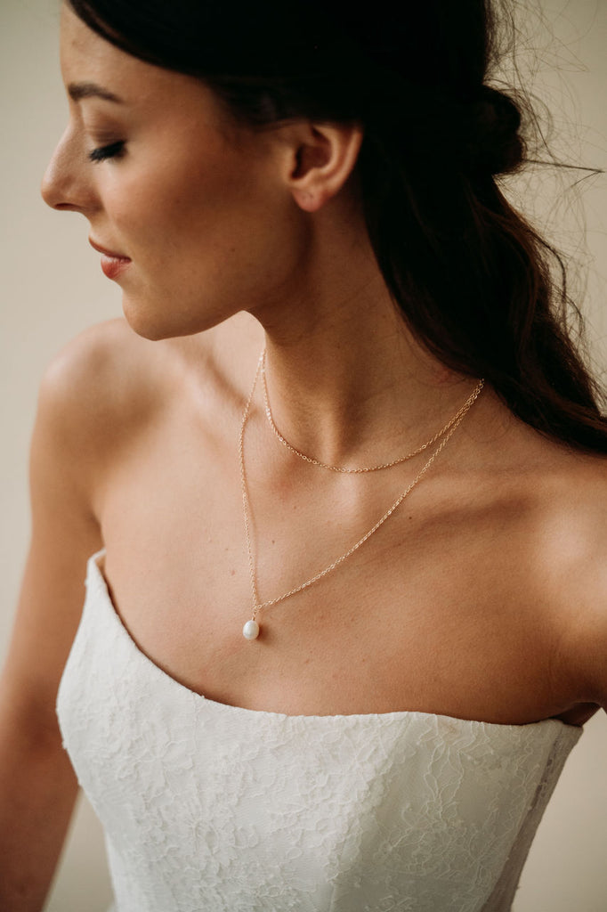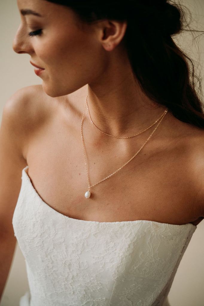Enhance your jewelry collection with the Delia Necklace. This double layer necklace features two luxurious gold chains and a lustrous freshwater pearl, perfect for both bridal occasions and everyday wear. With layers that add depth and sophistication, this necklace is a must-have for any elegant ensemble.