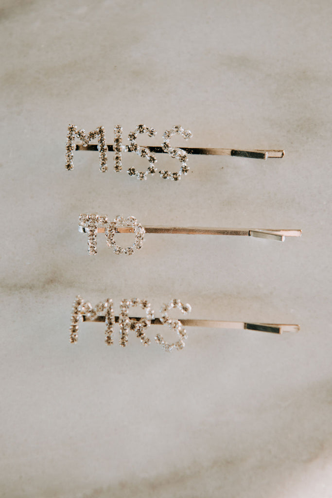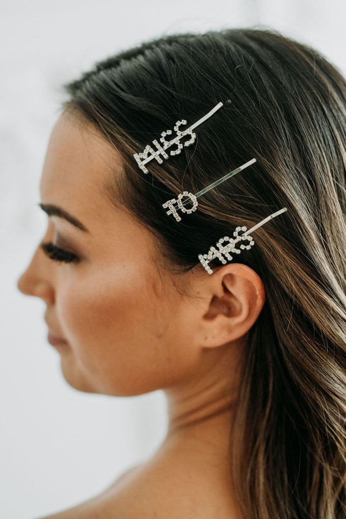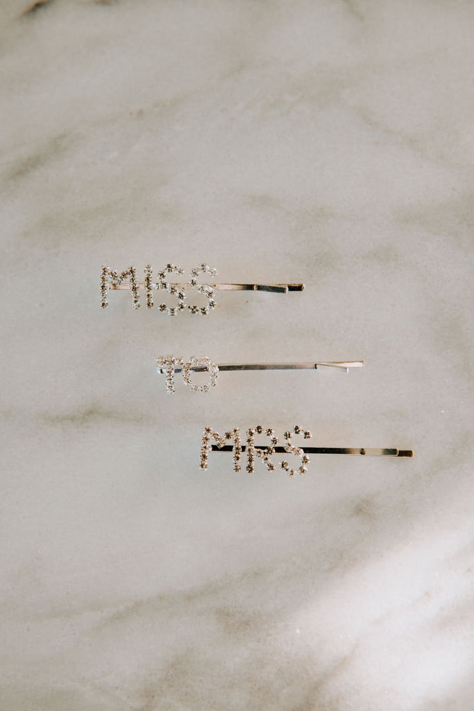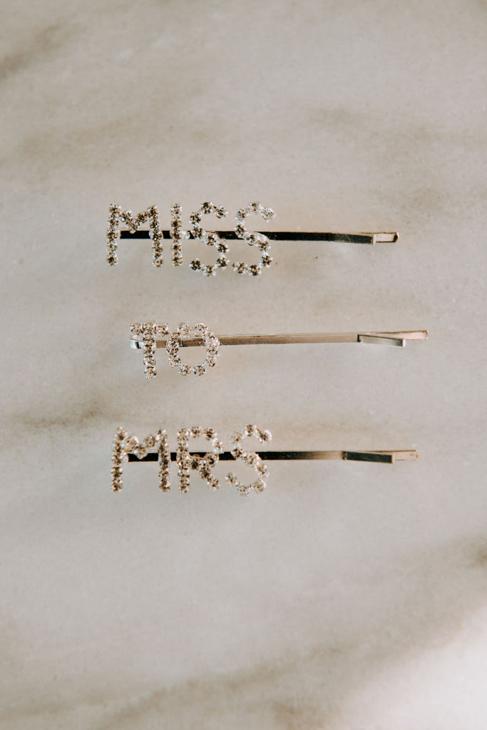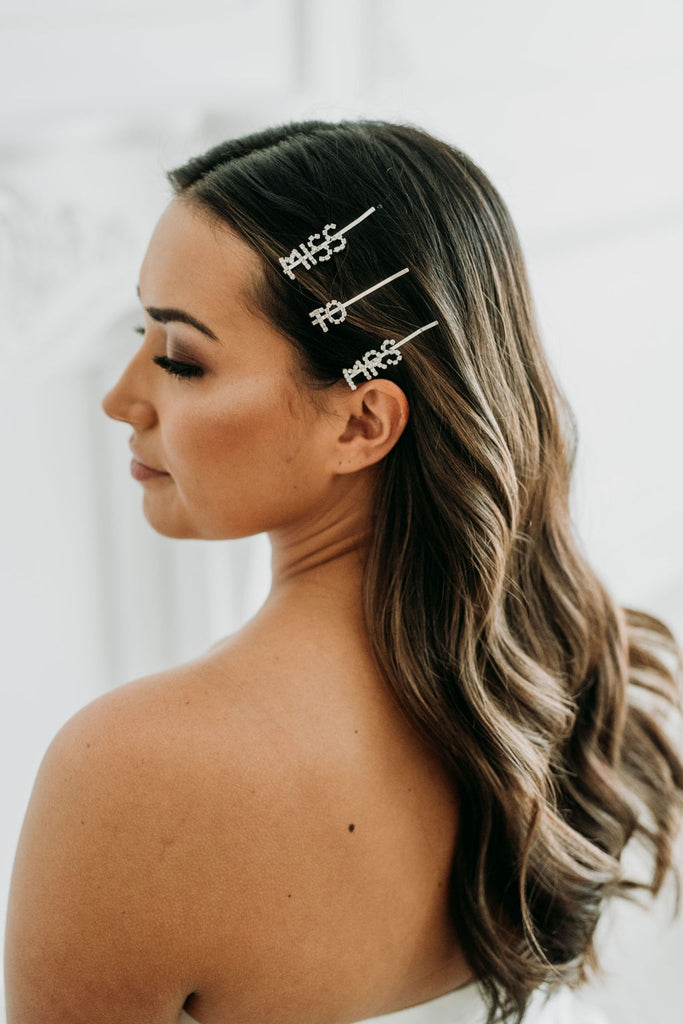 The perfect Bachelorette or Rehearsal Night accessory! Set of three crystal and silver Miss to Mrs Bobby Pins.