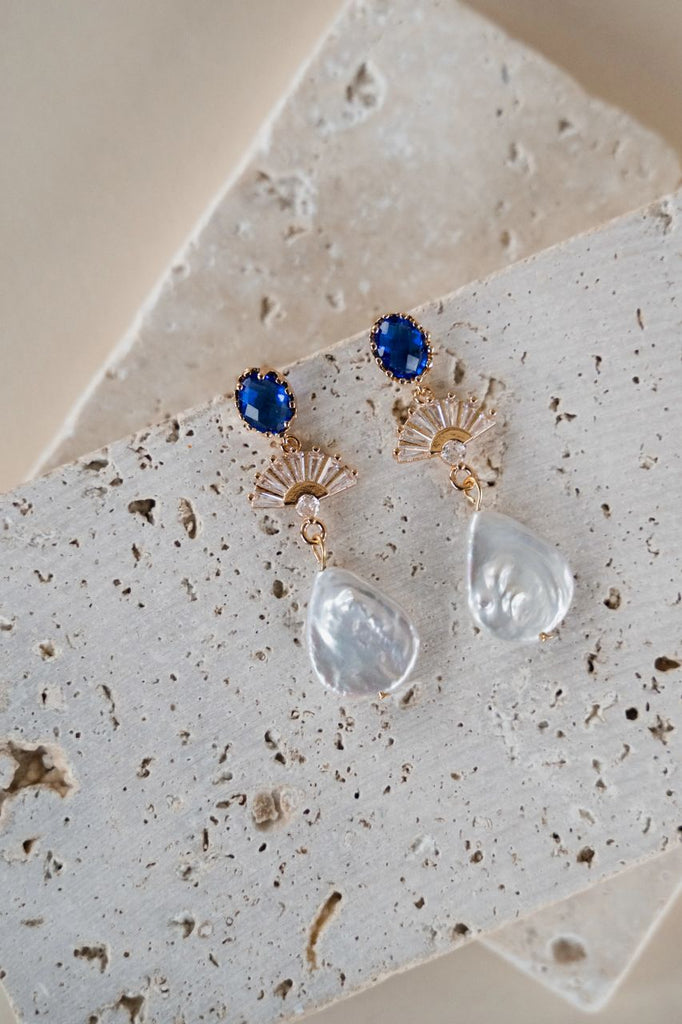 Add a touch of vintage glamour with the Praiano Earrings. Featuring sparkling art deco crystal charms paired with delicate freshwater pearl pendants, these earrings bring a playful sparkle to any bridal look. The blue crystal studs add a pop of color, making them perfect for those who love a fun twist on classic elegance. Ideal for weddings or special occasions, they effortlessly blend timeless charm with a lively spirit.