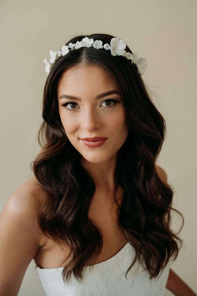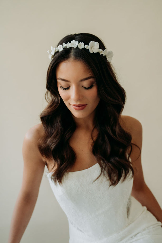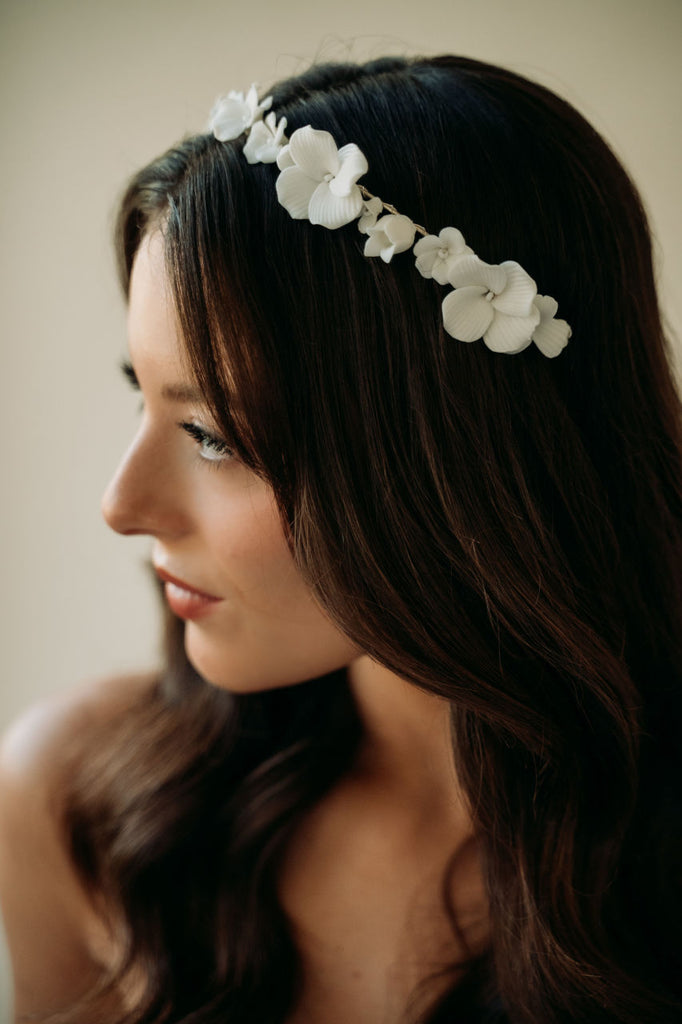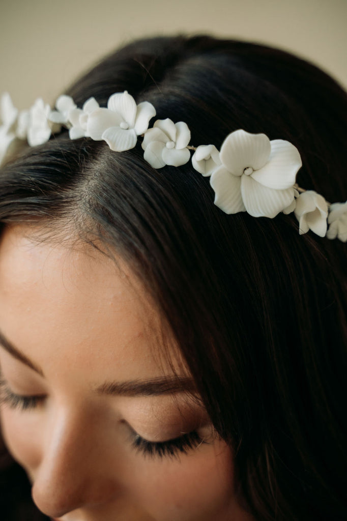 Our most intricate and stunning hairpiece yet. This hair wreath features stunning hand sculpted light ivory flowers hand wired to a light silver structured headband. This headpiece styles effortlessly and will take your bridal hair style to the next level.