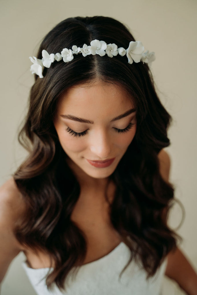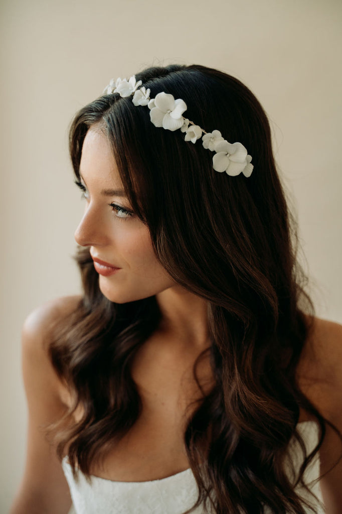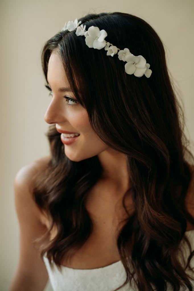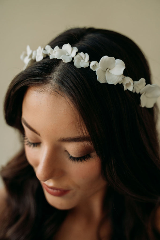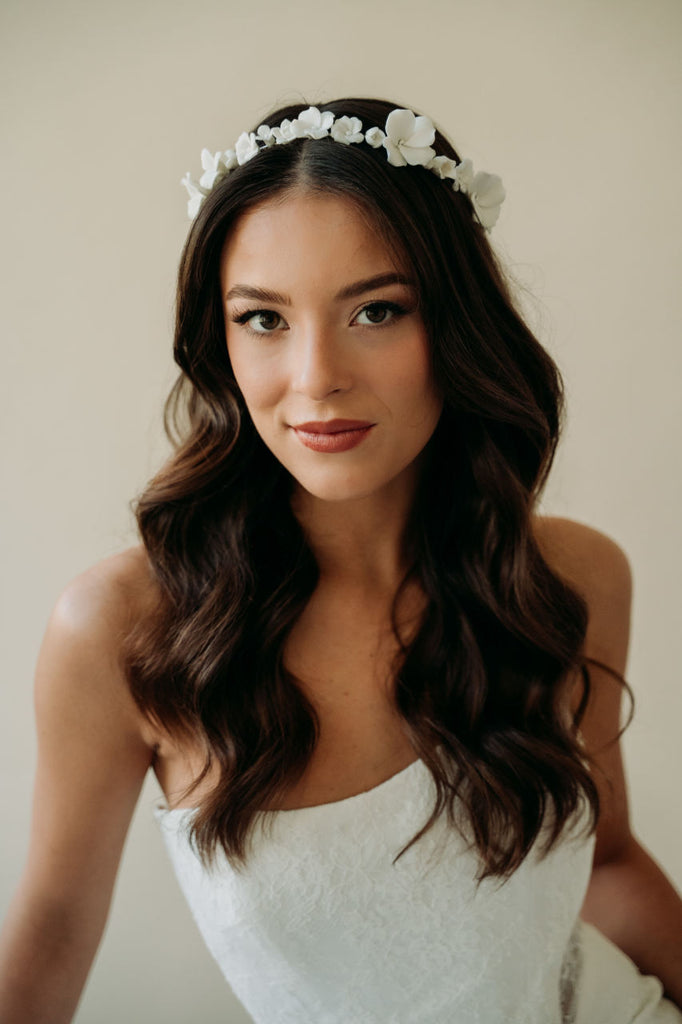Our most intricate and stunning hairpiece yet. This hair wreath features stunning hand sculpted light ivory flowers hand wired to a light silver structured headband. This headpiece styles effortlessly and will take your bridal hair style to the next level.