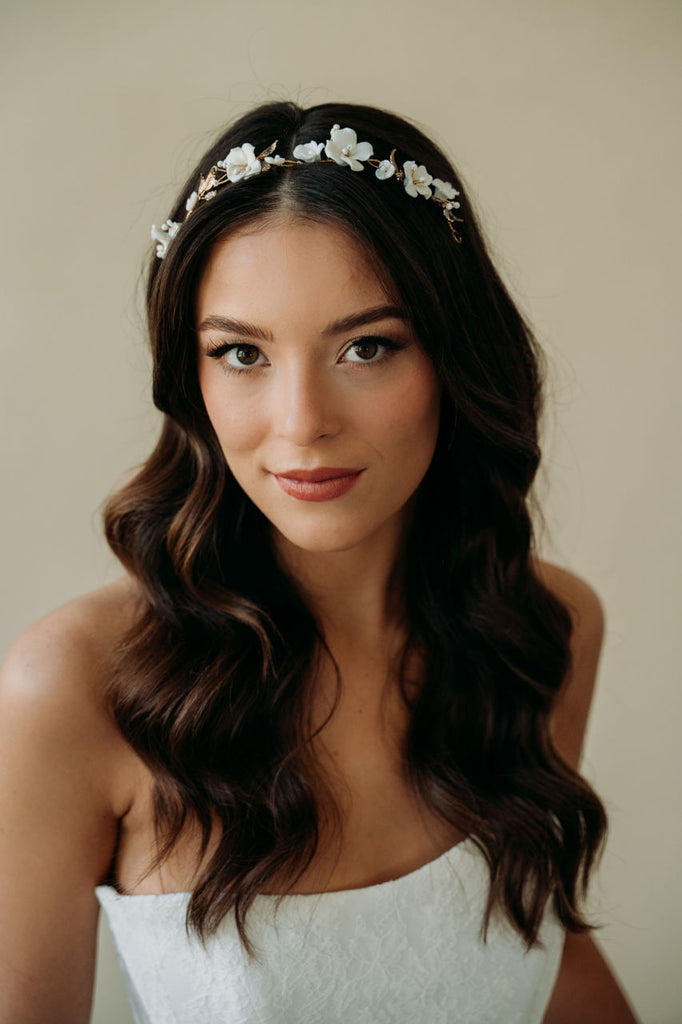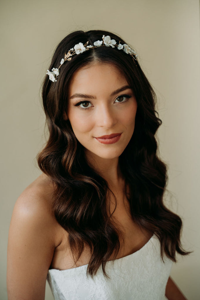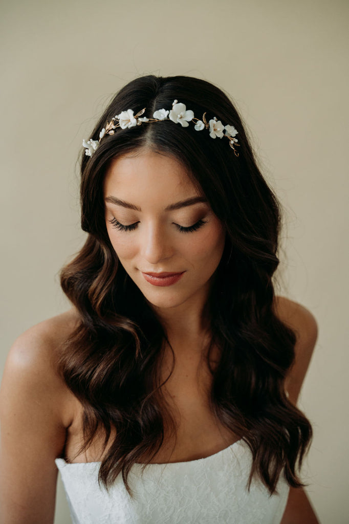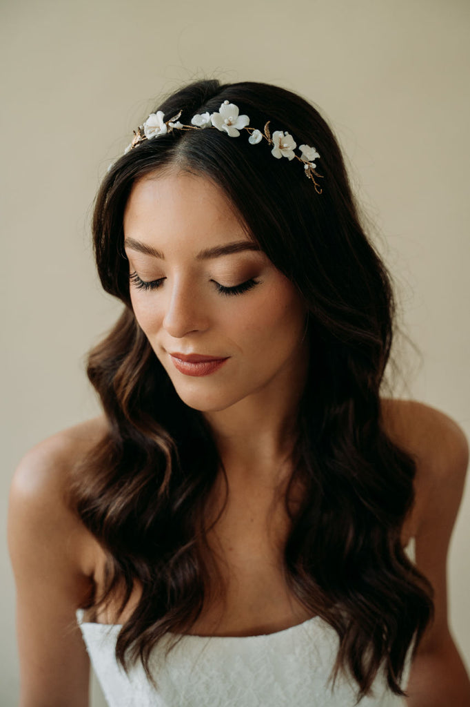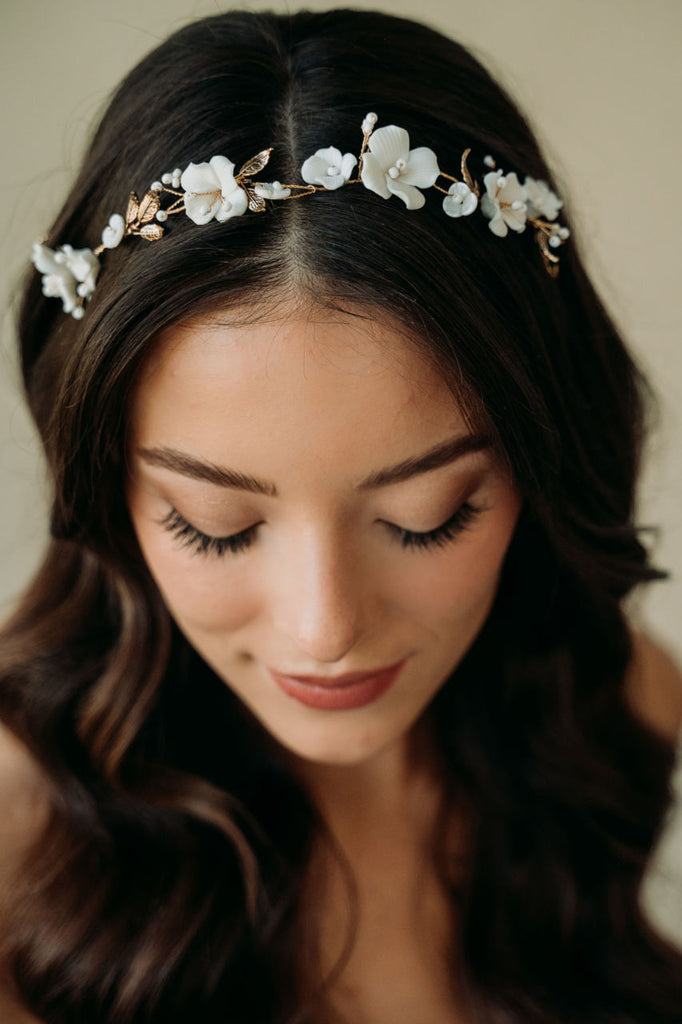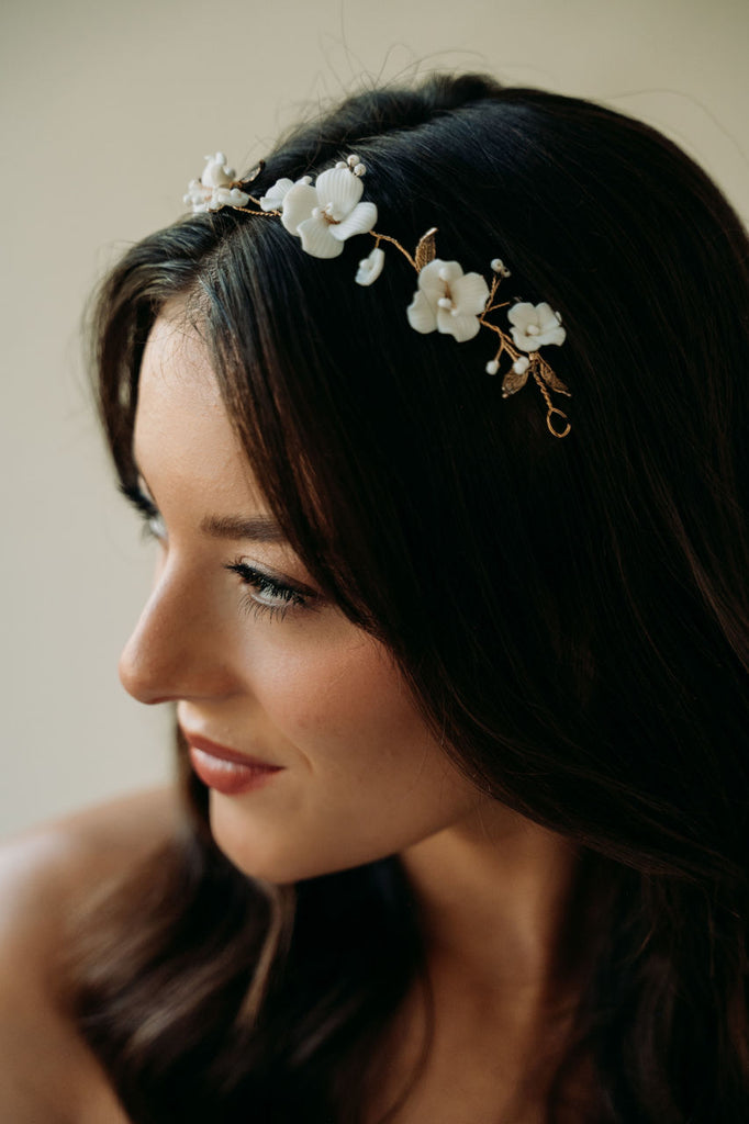 Inspired by spring blooms, our Tori hair vine features delicate hand sculpted light ivory flowers, shimmering white beads and vintage gold leaves strung on a hair vine.
